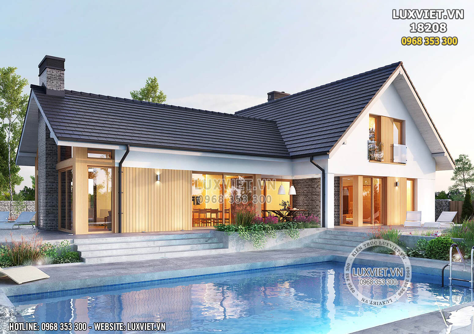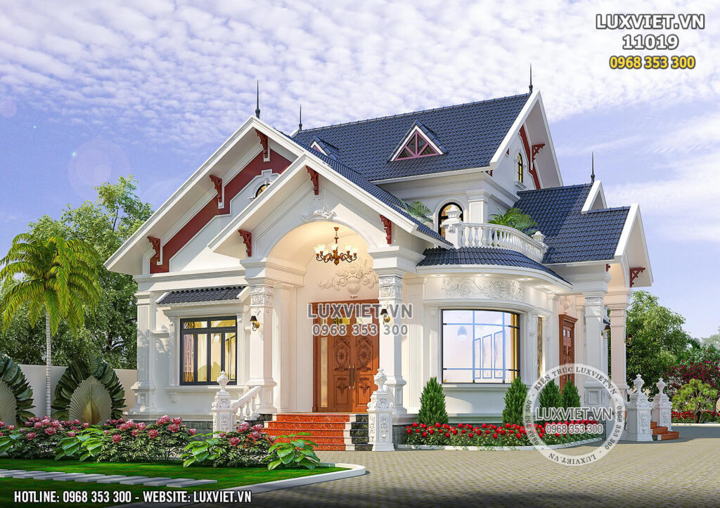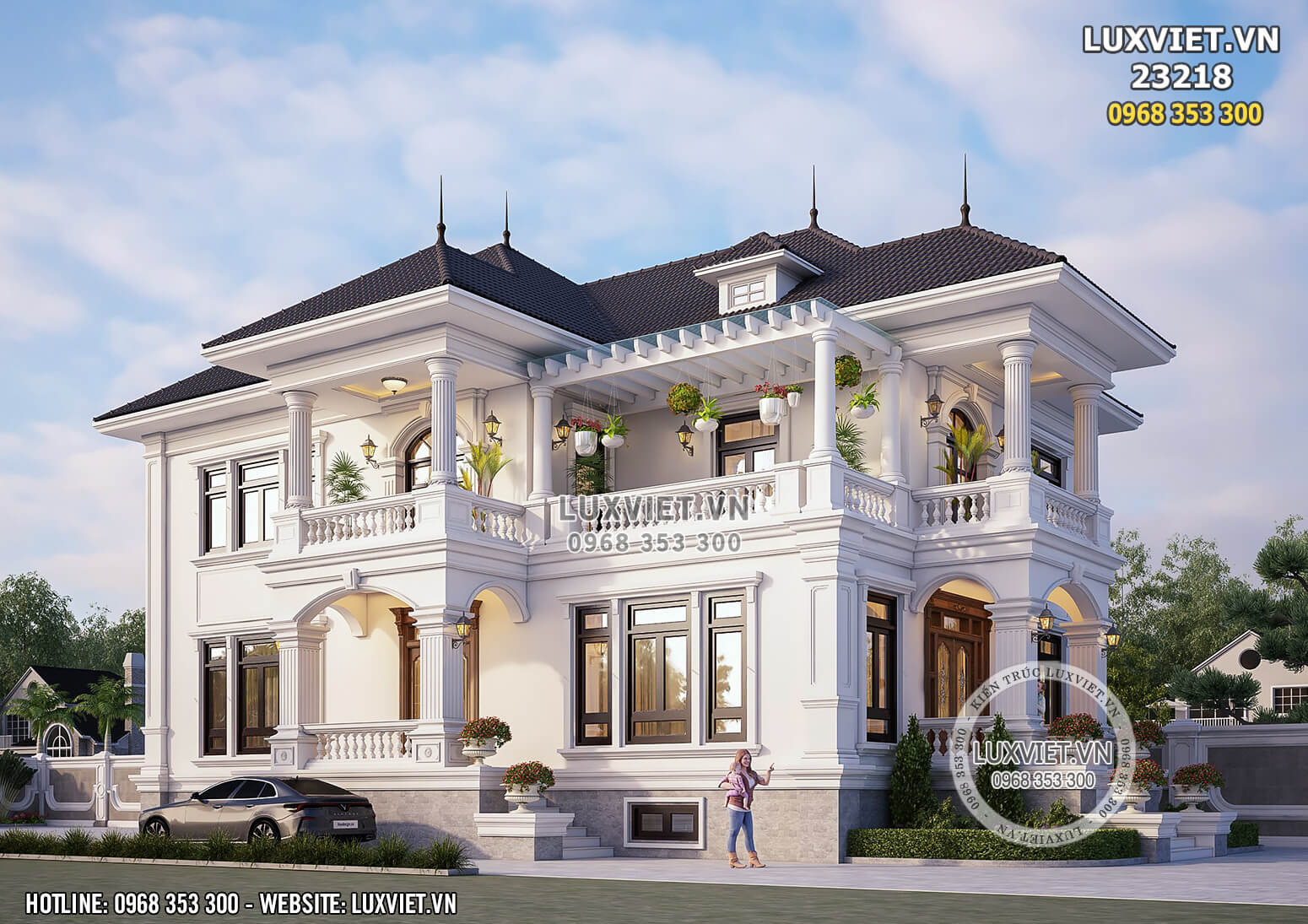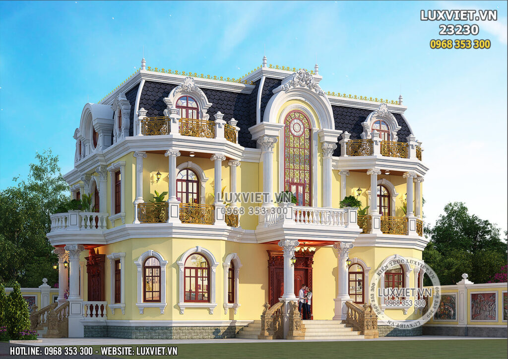 Biệt thự kiểu lâu đài 3 tầng được tọa lạc trên một khu đất rộng, các kiến trúc sư Trịnh Gia đã thiết kế khoa học kết hợp với không gian cây xanh thoáng mát phù hợp với công năng sử dụng của tùy từng chủ đầu tư. Toàn bộ lâu đài dinh thự là một cung điện nguy nga lộng lẫy, nhìn là đã yêu thích. Được sử dụng hai gam mù chủ đạo là màu trắng và vàng sữa, kết hợp với mái mansard xanh, mái vòm xanh tạo sự năng động, bề thế cho tổng thể ngôi nhà. Không những vậy chúng ta còn bị thu hút bởi những khối hệ thống hoa văn to, cầu kì, tinh tế.